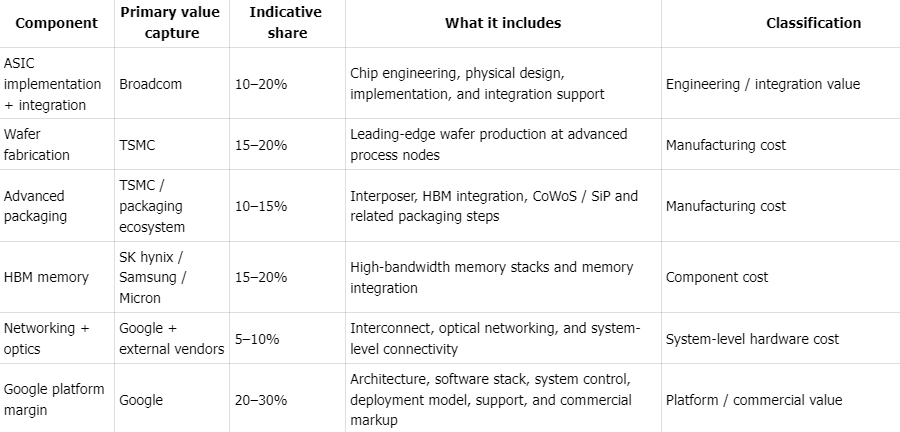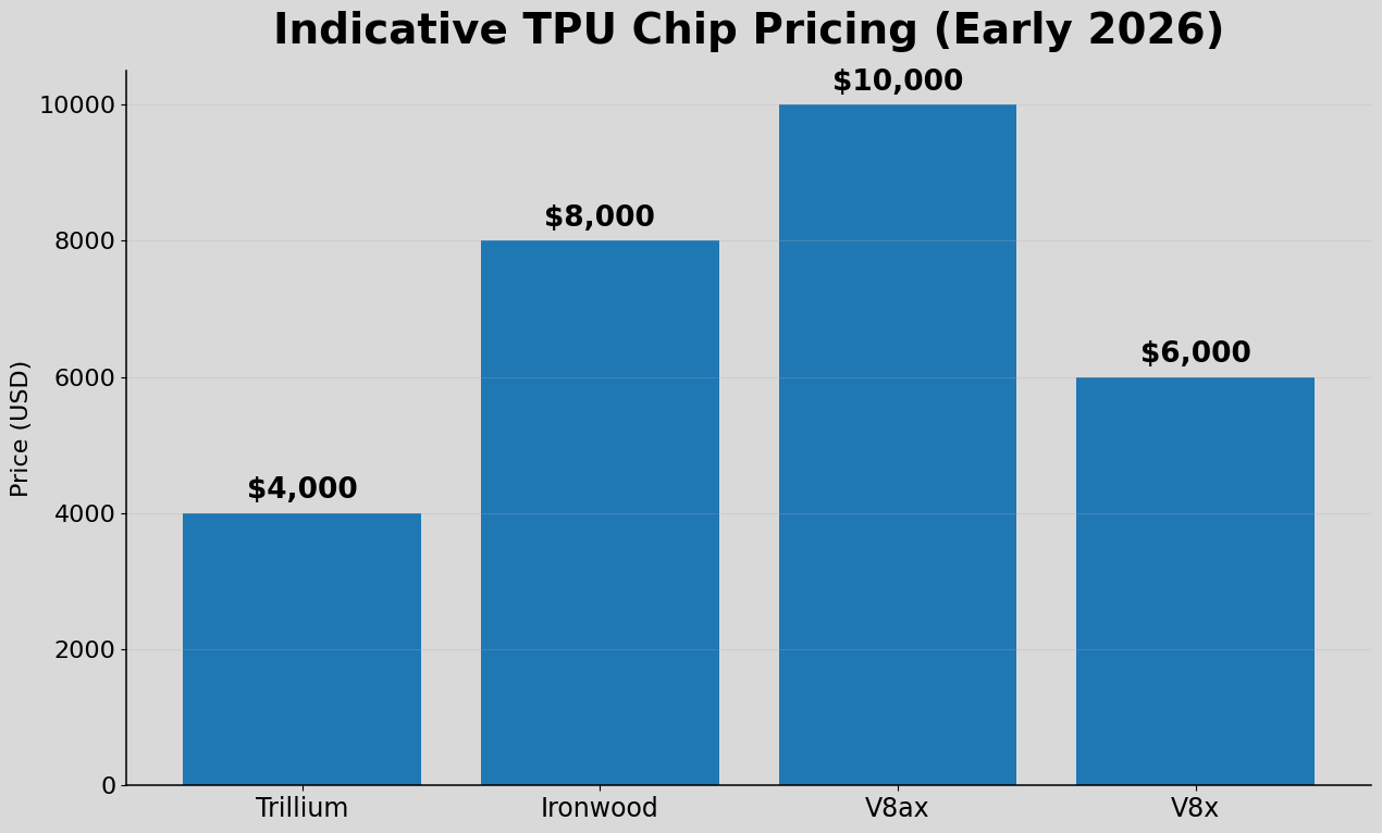 Google does not publicly disclose a standard standalone purchase price for TPUs. In practice, TPU economics are more visible through Google Cloud pricing and through directional industry checks than through a public list price. That is an important distinction: cloud pricing, transfer pricing, and end-customer economics are not the same thing, and they should not be treated as interchangeable.
