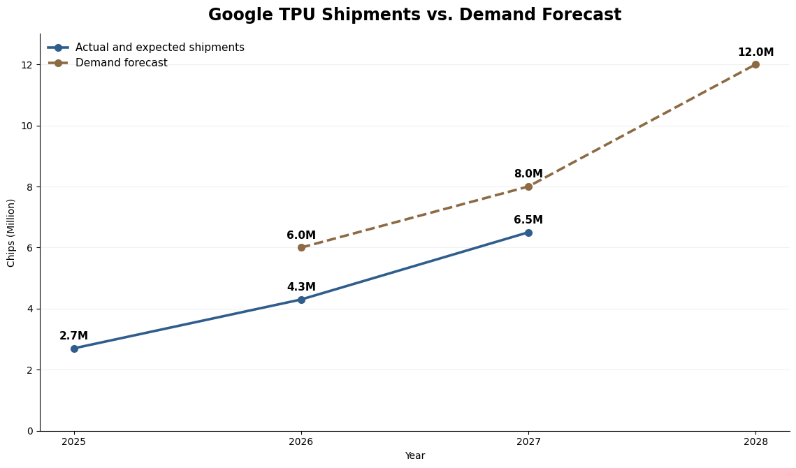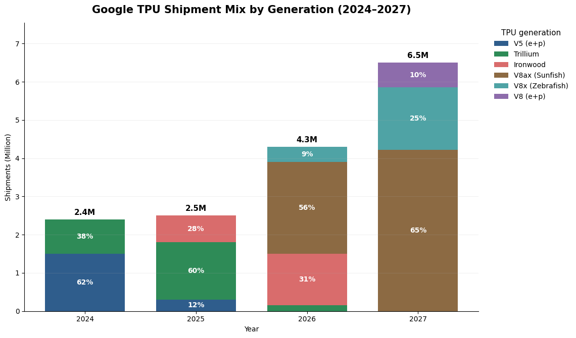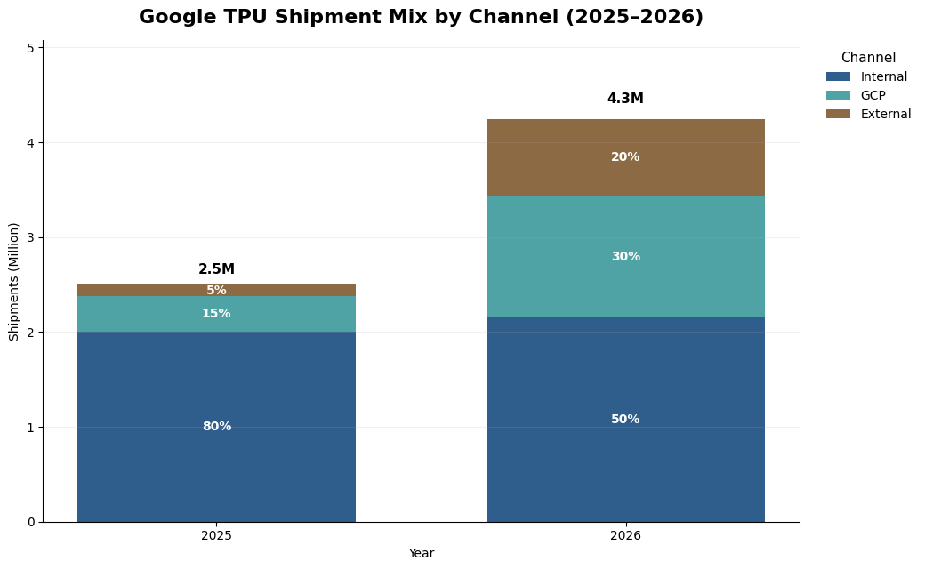 Google Cloud Platform: TPUs are becoming a more important differentiator for GCP, particularly in large-scale AI workloads where price-performance matters. Our channel work suggests GCP-related TPU increase from about 15% in 2025 to roughly 30% of total shipments in 2026. This suggests that Google Cloud is moving from a secondary channel to a major source of TPU commercialization. The customer base includes both enterprise workloads and AI-native model developers that access TPUs through Google-hosted infrastructure. Importantly, this category also includes large strategic customers that obtain TPU capacity through a rental model rather than direct ownership, such as Meta and Anthropic. As a result, part of what appears as GCP consumption is in fact strategic external demand delivered through Google’s cloud channel.