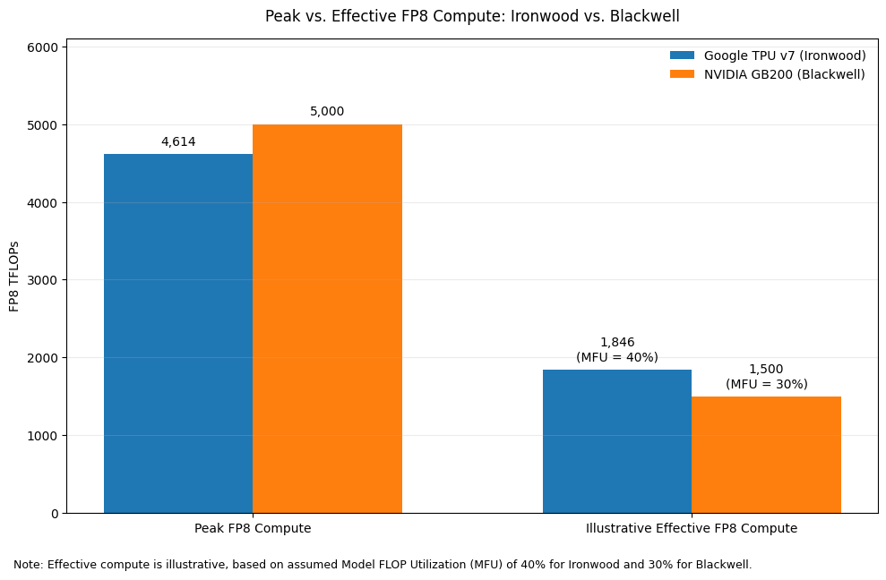 That said, comparing AI chips on FP8 performance requires an important distinction between theoretical peak compute and effective compute. In practice, the headline FLOPs figures marketed by vendors such as NVIDIA and AMD often reflect instantaneous peak performance achievable under favorable conditions, sometimes aided by dynamic voltage and frequency scaling, rather than the level of throughput that can be sustained across real production workloads. As a result, theoretical FP8 performance can overstate what users actually realize in large-scale training. For GPUs, actual utilization of advertised FP8 compute - often measured by Model FLOP Utilization (MFU) - is typically much lower, with real-world training workloads often achieving utilization levels around 30%. By contrast, Google’s TPU architecture is generally viewed as more conservative in how performance is specified, meaning its stated compute is often closer to sustainable delivered throughput. This matters because for highly optimized operators, effective compute can diverge materially from theoretical peak. In particular, elite users such as Anthropic have reportedly been able to push TPU utilization to around 40% MFU through deep system-level optimization, allowing TPUs to deliver very strong effective compute economics even when their headline peak FLOPs remain slightly below NVIDIA’s top-end figures. In other words, while NVIDIA may still lead on nominal peak compute, TPU can be more competitive on usable compute than raw spec-sheet comparisons alone would suggest.