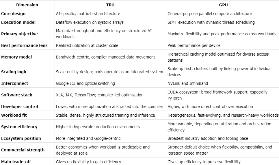 The TPU vs. GPU debate is often framed as a chip competition. More fundamentally, it is a competition between architectural philosophies.NVIDIA has built the dominant general-purpose AI compute platform. Google has built a more specialized system optimized for delivering AI efficiently at scale.As the industry shifts from training models to serving them economically, the key distinction will increasingly be not peak performance, but realized performance; not flexibility alone, but efficiency at scale.