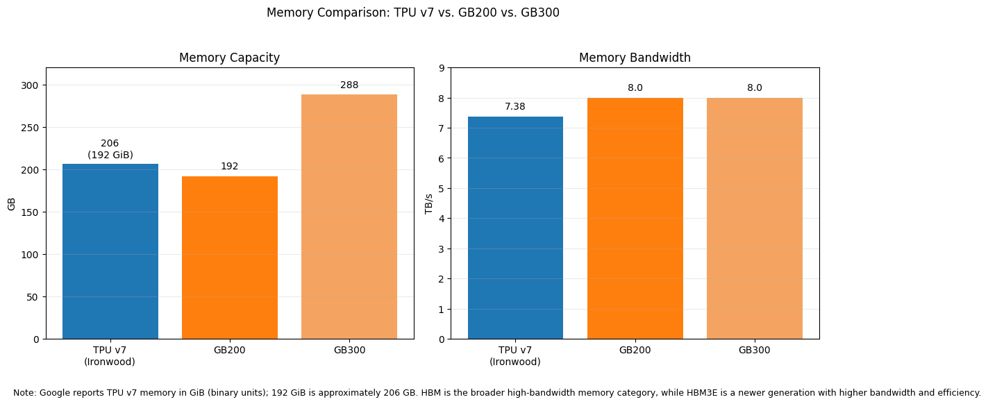 Memory capacity and bandwidth: TPU had historically been at a disadvantage, but that weakness has been substantially reduced in the latest generation. Google states that TPU v7 includes 192 GiB (192 GiB ≈ 206 GB. ) of HBM per chip and 7,380 GB/s of HBM bandwidth, a major step up from prior TPU generations. This means TPU v7 now matches GB200 on memory capacity, as NVIDIA’s Blackwell platform is commonly described with 192GB HBM3E (HBM is the memory category; HBM3E is a newer generation with higher bandwidth and improved efficiency)at the GB200 level. That said, NVIDIA still extends its lead at the upper end with GB300, which raises memory capacity to up to 288GB HBM3E per GPU and bandwidth to roughly 8 TB/s. So on memory, the latest comparison is no longer “TPU far behind GPU”; instead, it is more accurate to say that TPU v7 has reached parity with GB200-class capacity but still trails GB300 at the frontier end of the Blackwell Ultra family.