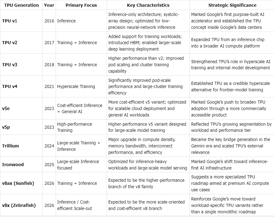 The broad progression is clear. TPU v1 was inference-only and built around low-precision matrix operations. TPU v2 and v3 added training support and high-bandwidth memory. TPU v4 marked the emergence of pod-scale deployment and serious competition with NVIDIA in large training environments. Later generations introduced clearer segmentation across training and inference use cases, alongside higher performance-per-watt and stronger large-model efficiency. Looking ahead, market expectations point to a continued separation between high-end training systems and more cost-optimized inference-oriented SKUs, although the exact future product roadmap should be treated with caution unless explicitly confirmed by Google.
