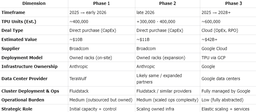 The partnership between Anthropic and Google Cloud is a structurally complex AI infrastructure agreement, combining direct hardware procurement with long-term cloud capacity commitments. Anthropic plans to deploy up to ~1 million TPUs, with a significant portion sourced as rack-level systems directly from Broadcom, alongside large-scale consumption through Google Cloud. The relationship is structured as a hybrid model: Anthropic secures baseline capacity and control via owned infrastructure, while leveraging GCP for elastic scaling, orchestration, and managed services.